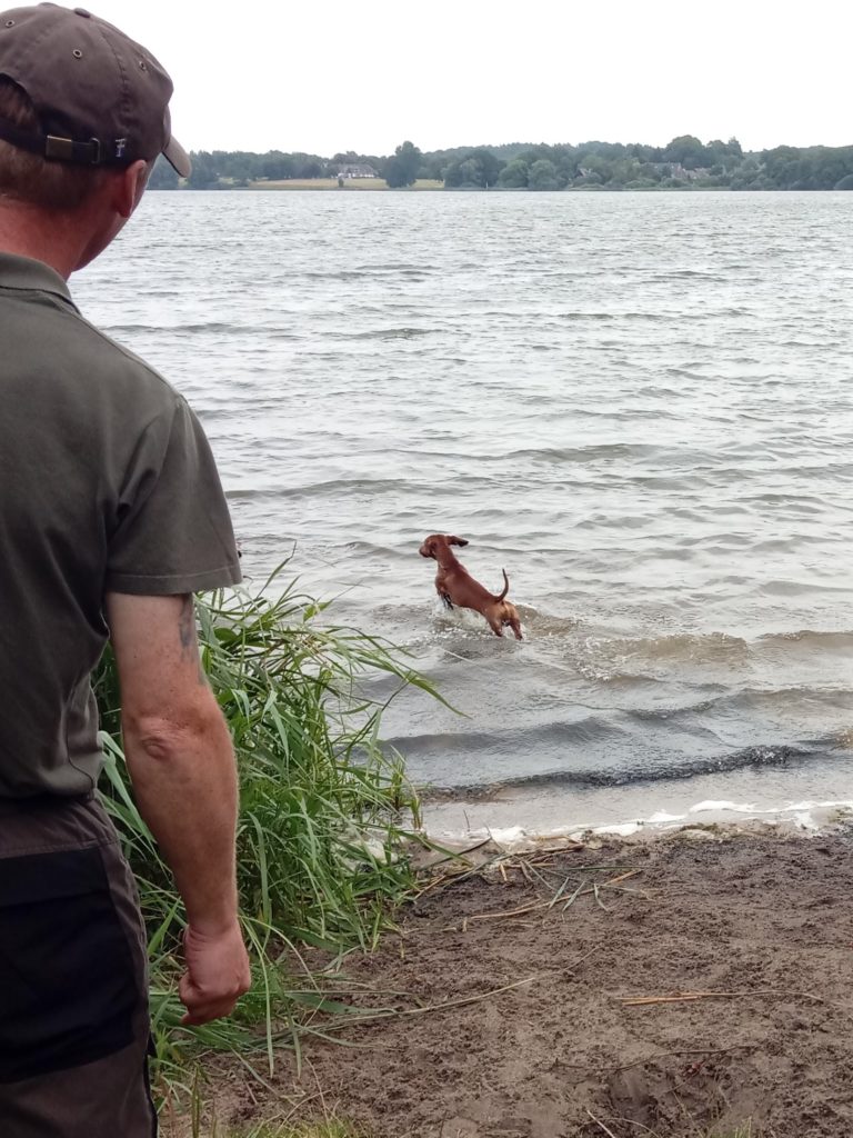 Der überwiegende Teil unserer Teckel zeigt eine ausgeprägte Freude am und im Wasser. Dies ist ein zusätzlicher Hinweis auf die Wesensfestigkeit. Bei der Wasserfreude wird ein beliebiger, schwimmfähiger Gegenstand (kein Wild) vom Hundeführer mindestens 6 – 8 m weit in tiefes, stehendes Wasser geworfen. Der Teckel soll den Gegenstand freiwillig bis zum Ufer holen.